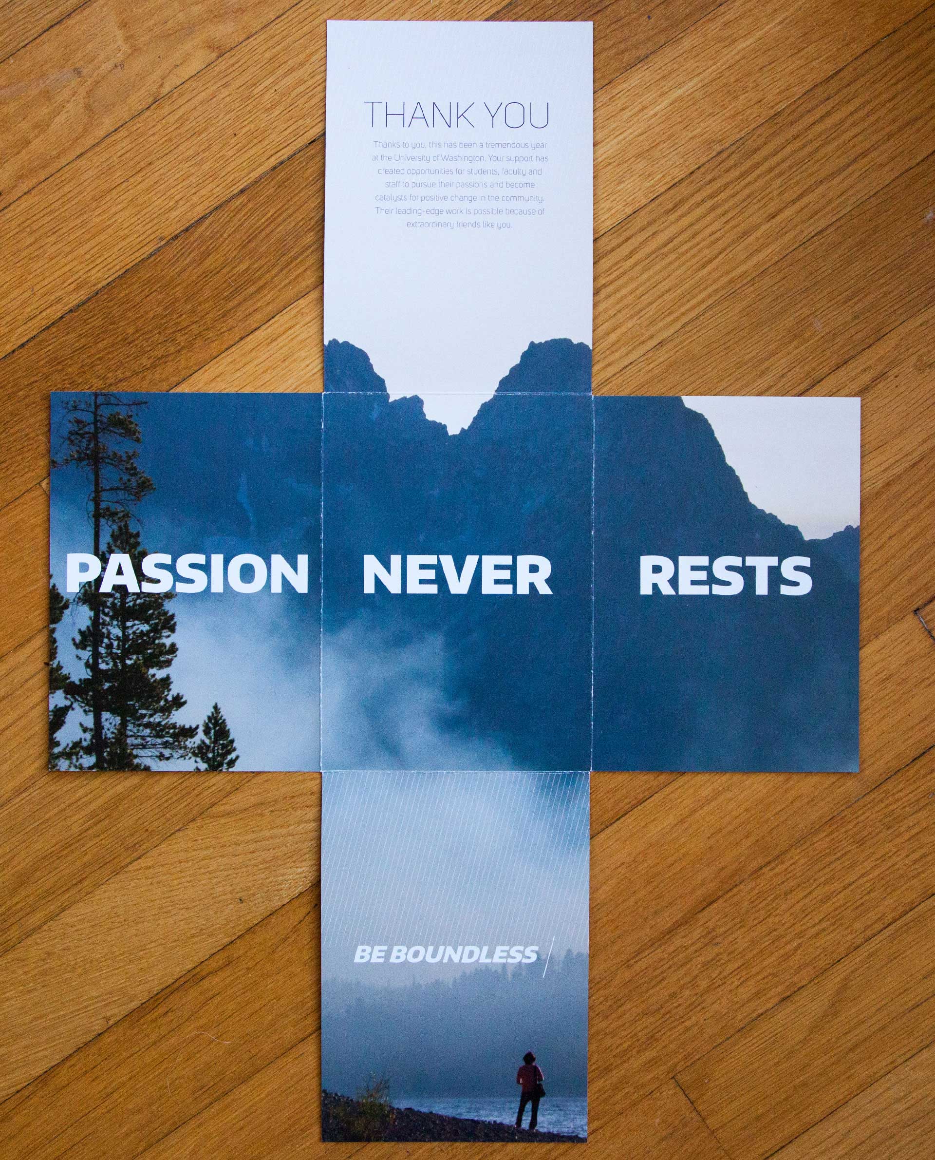 The funds raised by the Office of Annual Giving serve as the foundation for all University fundraising efforts. These collective gifts provide a stable source of support to meet the needs of the University. This mailer showcased some of the amazing stories that these contributions have helped come to fruition. As the piece unfolds the reader would unveil the tennet "passion never rest", a guiding tenet for the institution.